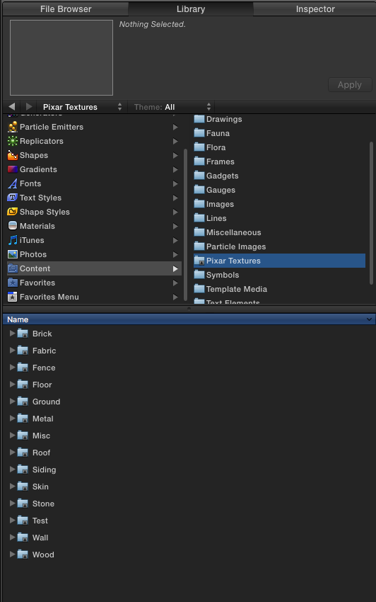 Restart Motion. Navigate to the Library tab > Content and you should find the Pixar Textures folder in the right column. Selecting the folder will open the collection, ordered by folder, in the content pane at the bottom.