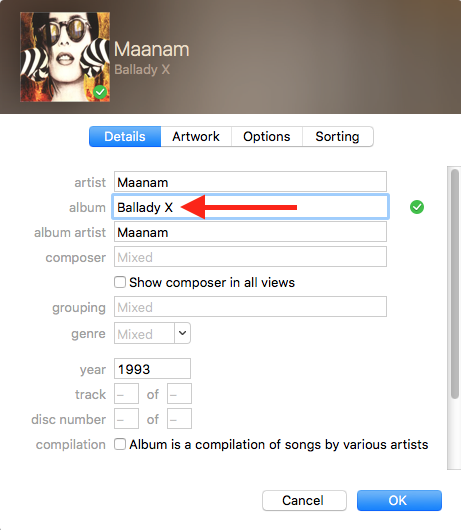 If the Album field, however, displays the title in Get Info correctly, a different method is required. This time add an extraneous letter to the end of the album title (an “X” works well). Click OK to close Get Info. This forces iTunes to save the temporarily changed title. Re-open Get Info and now delete the extra letter. Click OK to save and close.
