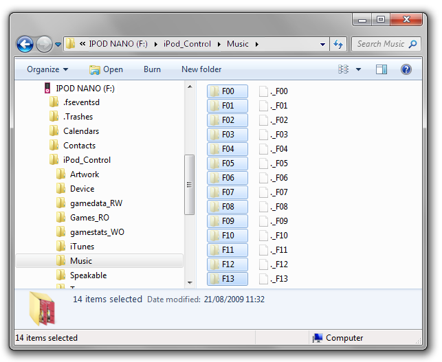 To begin the recovery process browse to Device > iPod_Control > Music, select the folders within and copy them with Ctrl+C (Windows) or Cmd+C (Mac). You can ignore any ._F## files you may see. These may show in a Windows formatted device that has been updated on a Mac.