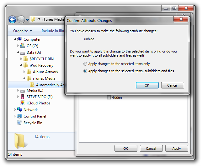 Next you need to unhide the hidden folders or iTunes will discard them and their contents rather than importing to the library. For Windows select all of the folders you have pasted in, right-click and select Properties, untick the Hidden checkbox and click OK, then confirm that you want to make the changes. On a Mac you may need to go into each F## folder in turn and manually move the files up one level as the command to unhide folders doesn't appear to work.