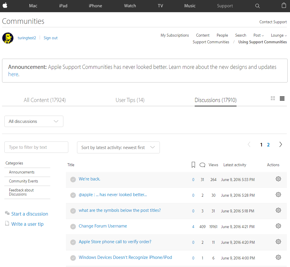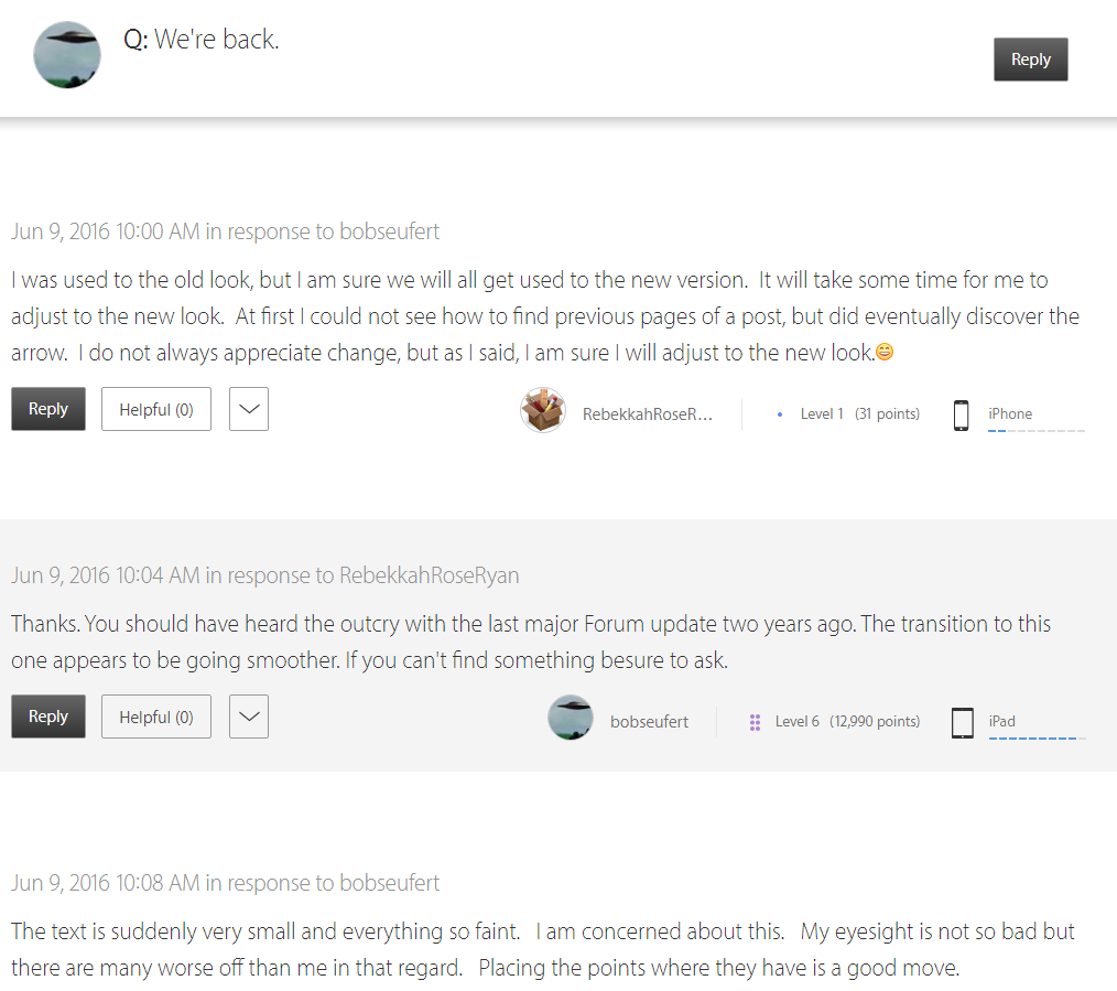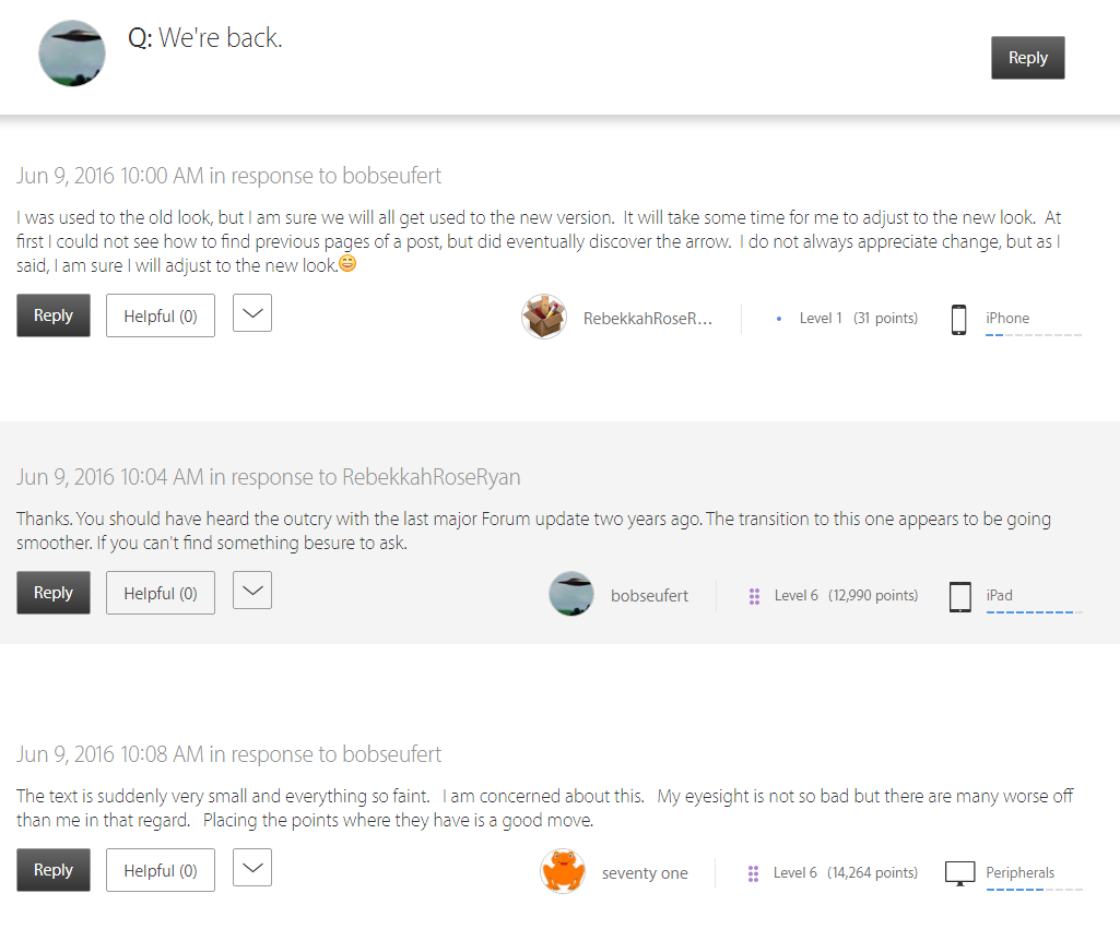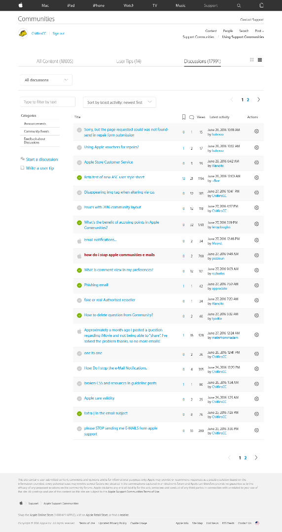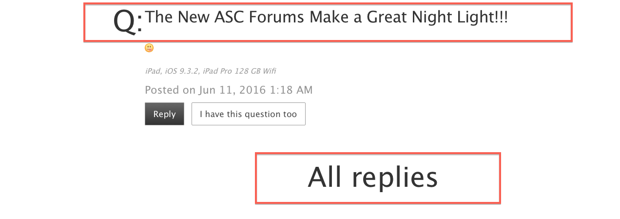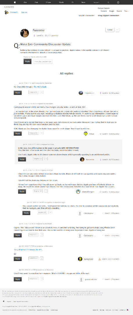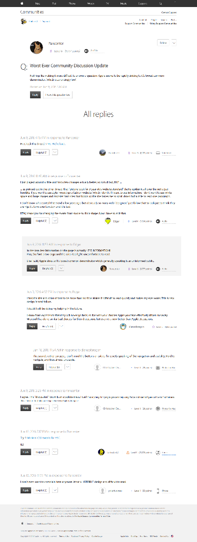 The June 2016 overhaul of Apple Support Communities hid some useful cues to updated content and, for some, made fonts too large, and added too much white space. There is an ongoing project running in the user tip Adjust the format and layout of ASC Web Pages which attempts to completely rewrite the layout. Here I'm going to post a smaller set of tweaks that address some of the issues that bug me the most. Expect it to get updated from time to time. In particular a site overhaul on July 7th has made the font size and weight tweaks no longer necessary so these are commented out in the final code below, but they can be enabled and adjusted to suit if required.