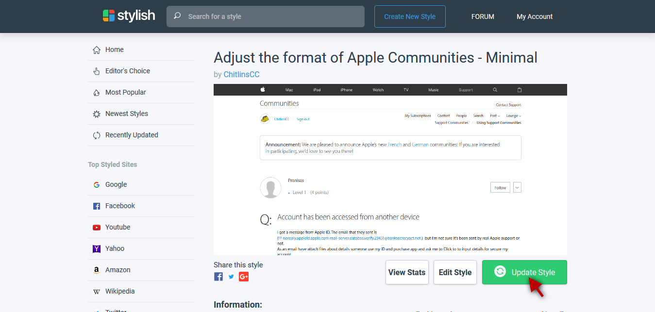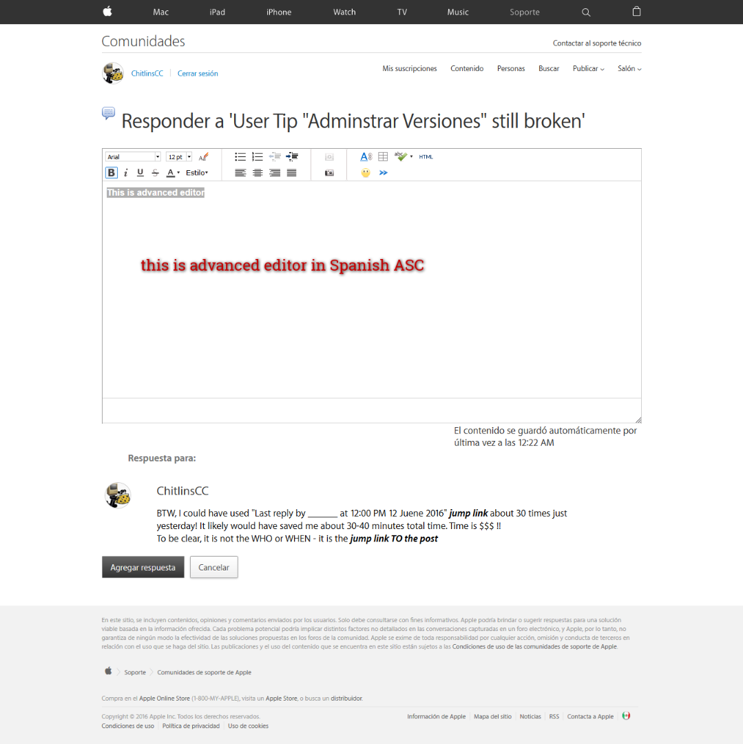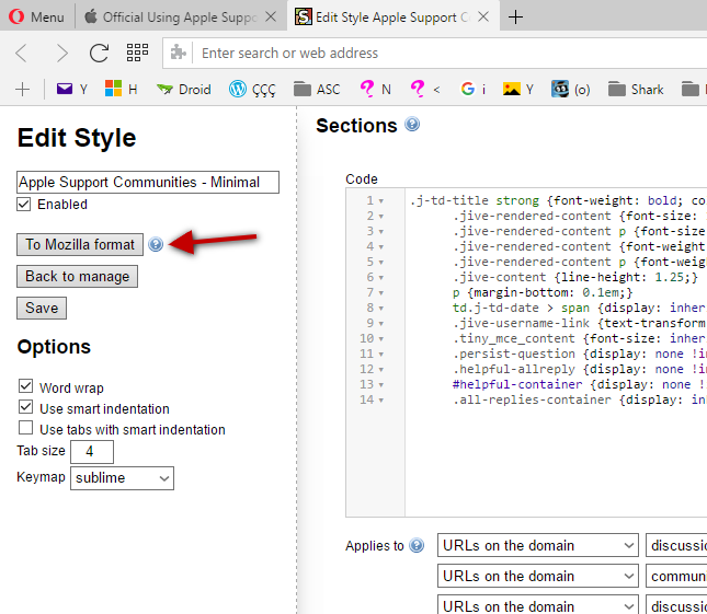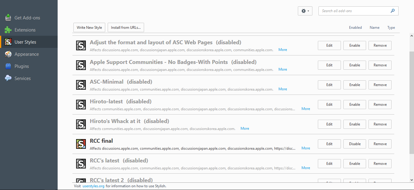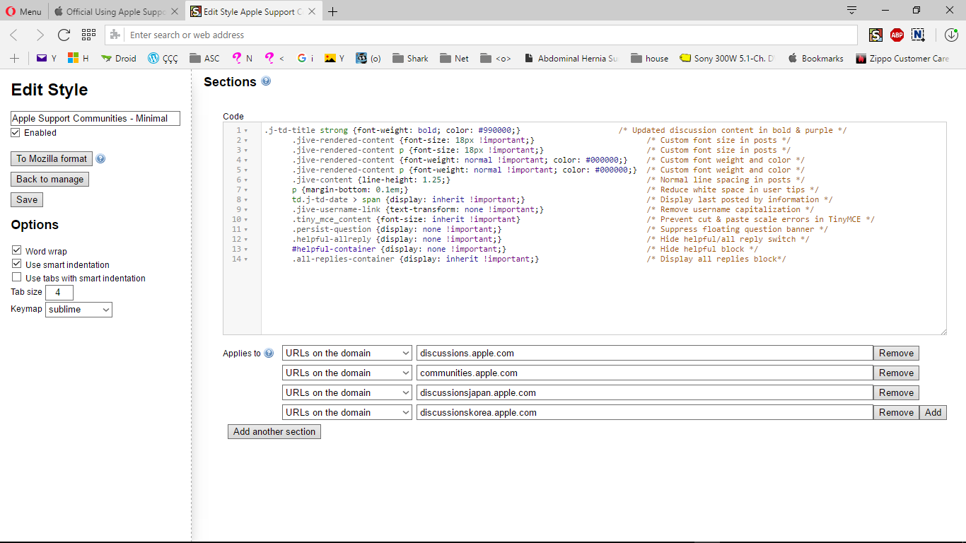 Once you've got Stylish installed in your browser you can create a new style, give it a name such as ASC, then copy in the block of text below and make it active for URLs on the domain discussions.apple.com. You can make further adjustments as you see fit, e.g. choosing your own font size, line spacing and highlight color. If you're visiting ASC's sister sites for other languages you can also enable the CSS on communities.apple.com (French, German, Spanish, & Portuguese), discussionschinese.apple.com (Chinese), discussionsjapan.apple.com (Japanese), and discussionskorea.apple.com (Korean).