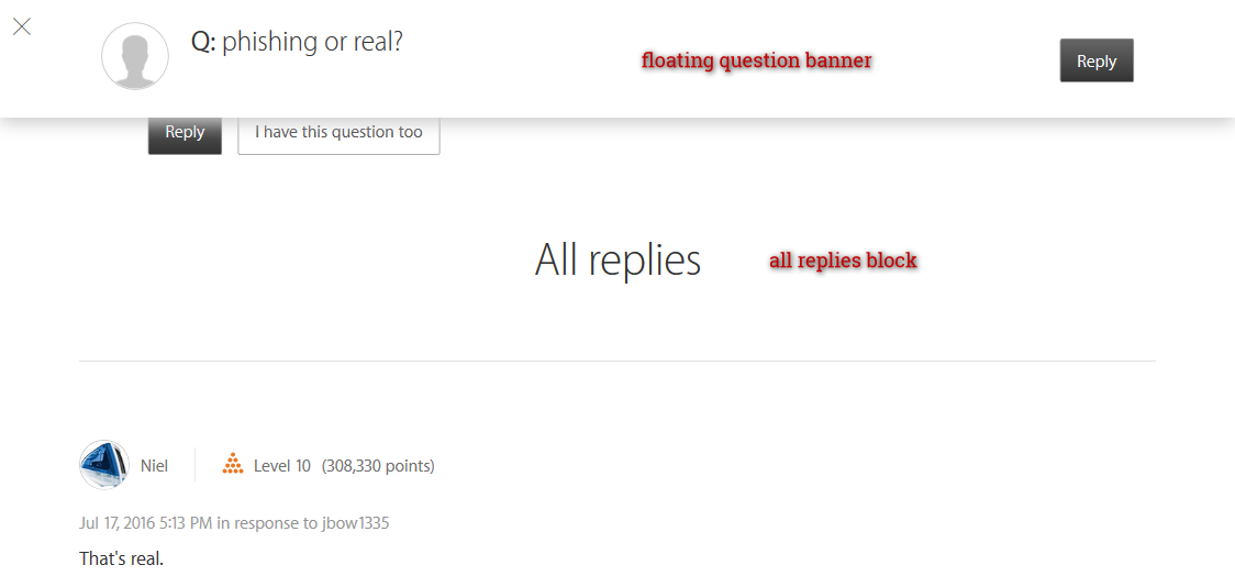 The new features that hide answers and keep the original question floating at the top of the page might possibly suit users where there is a simple question and answer pair, but they are frustrating when you're tying to keep up with the latest addition to an ongoing conversation. These four lines in turn suppress the floating question banner, the control that switches between all and helpful replies, the duplicate copies of helpful replies, and then forces the display of all replies when they might otherwise be hidden.