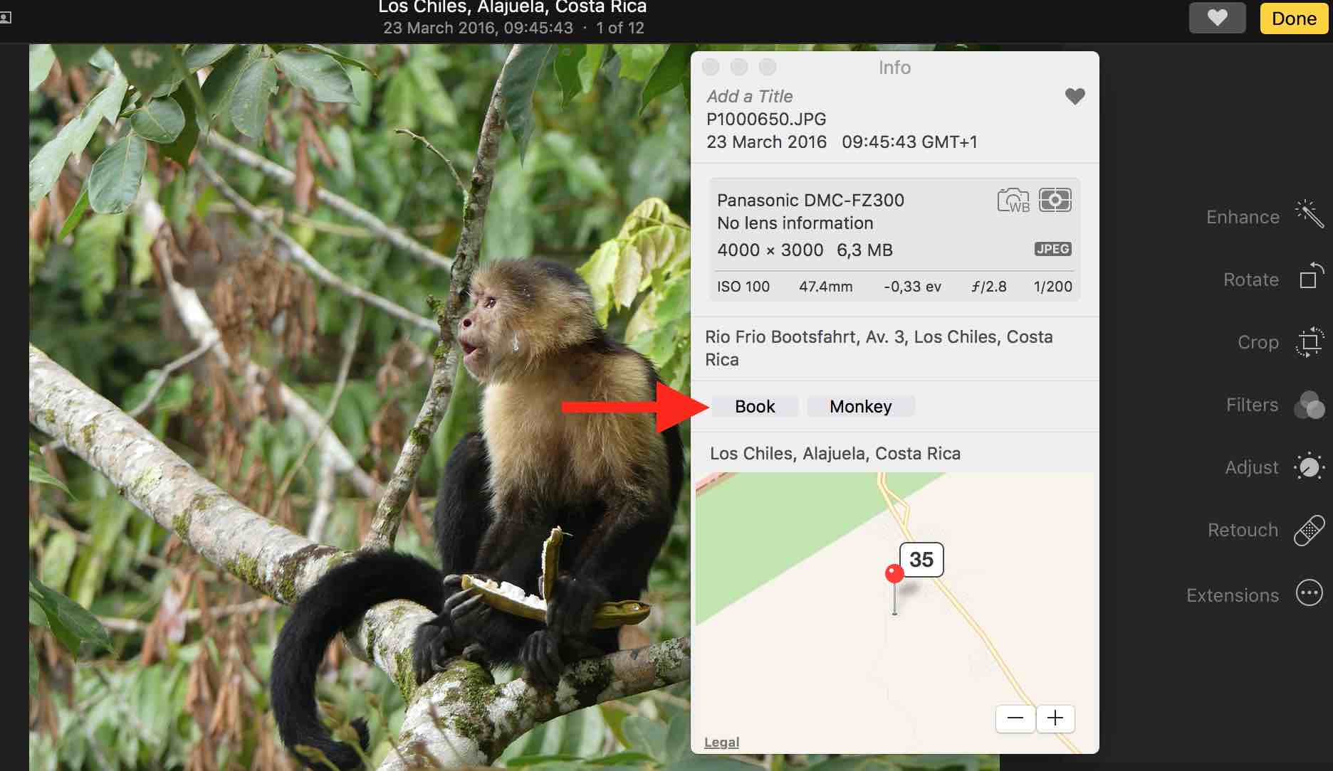 - Now you can select and copy the metadata you want to use in your caption or add a keyword to the photo by typing the keyword into the keywords section of the info panel, e.g. "Book".