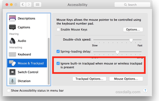 But there is a one facility in Accessibility that is well worth taking note of for when you find yourself accidentally brushing against the Macbook track pad while using a mouse. To find it, you go to Apple logo (top menu left) > Systems Preferences > Accessibility > then scroll down the left hand panel as far as Mouse and Trackpad. Clicking on that, the right hand panel changes to show additional Mouse and trackpad options. It's a fact that these additional options are invaluable in themselves but for now we are dealing with interference. This applies to any Macbook, Macbook Air or Macbook Pro.