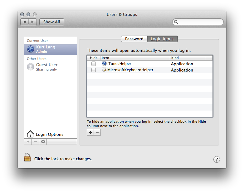 - Go back to the Resources folder on the desktop, select the file MicrosoftMouseHelper or MicrosoftKeyboardHelper, then drag and drop it into the Login Items window on the right hand side of the Login Items page (in the System Preferences window).