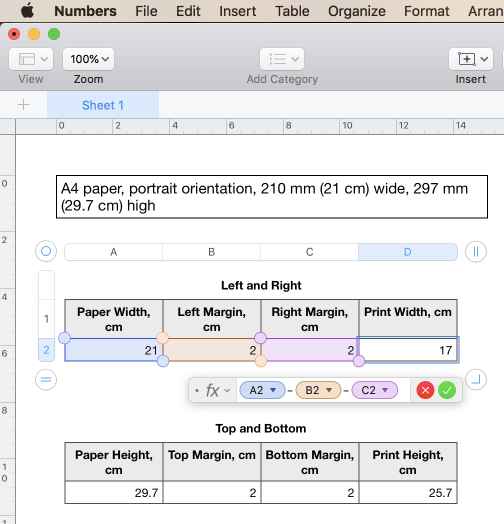 Here we go with A4 paper and millimetres (which become centimetres on Numbers rulers 😕).