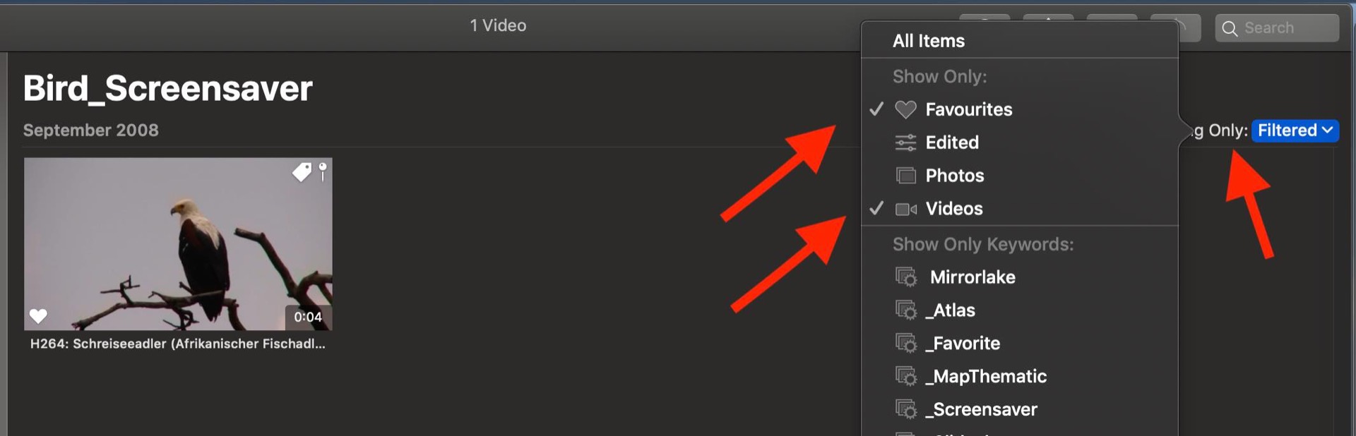 The "Showing" filter in the upper right corner of the viewer lets you specify criteria to select a subset of the photos, matching the criteria. Click the "Showing (only)" in the upper right corner to see the filter rules, that are currently checked. You can set the filter to show only Favorites, or Edited photos, or the media kind photos or video. And you can filter by the applied keywords. Filters are making the use of keywords really powerful. If you check more than one option in the filter, you will only see the items, that are matching all criteria.For example:Here the "Showing" filter has been set to show only the favorite videos.