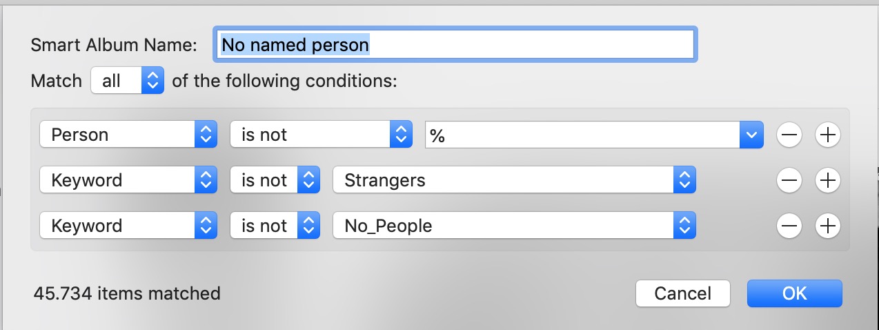 But it will include all photos with no face at all. It is just looking for photos without named people. We have to do some extra work to weed out the photos with no people at all. We have to do this only once by tagging these photos with keywords.I am using two additional keywords. When I come across photos without people in them (nature photos or buildings) I add the keyword "No_People". And if there are unknown persons, I add a keyword "Strangers".