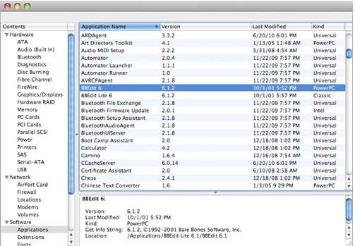 Note the triangle to the left of Software has to be pointed down for the Applications to become visible. Note the right hand side of the the Applications listing when selected says if you have PowerPC, Classic, Intel, or Universal. PowerPC & Classic indicate PowerPC only. Classic indicates it only runs on a PowerPC with Mac OS 9 running in the Classic environment or booting into Mac OS 9.