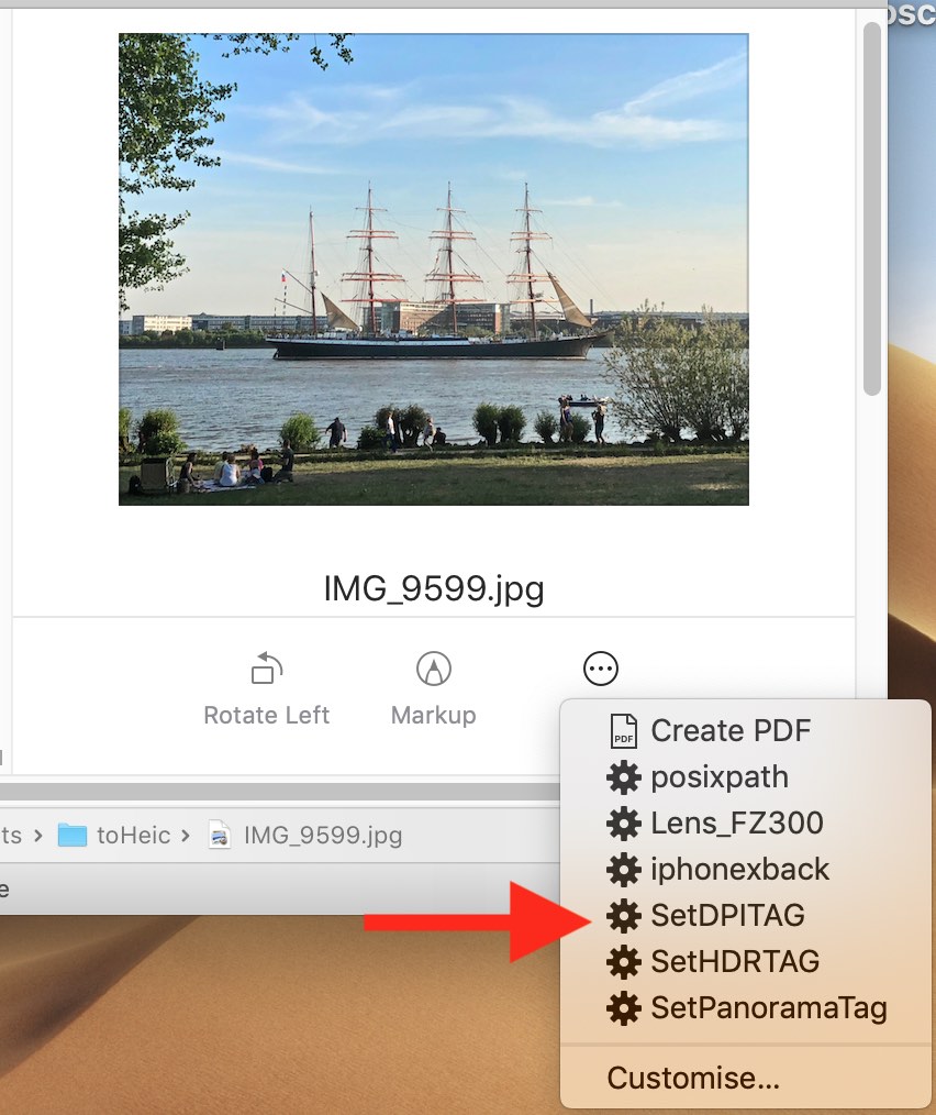 Now you can select a photo in the Finder (exactly one photo) and run it from the Quick Action section in the preview of the image (exiftool does not yet work for HEIF images, however):