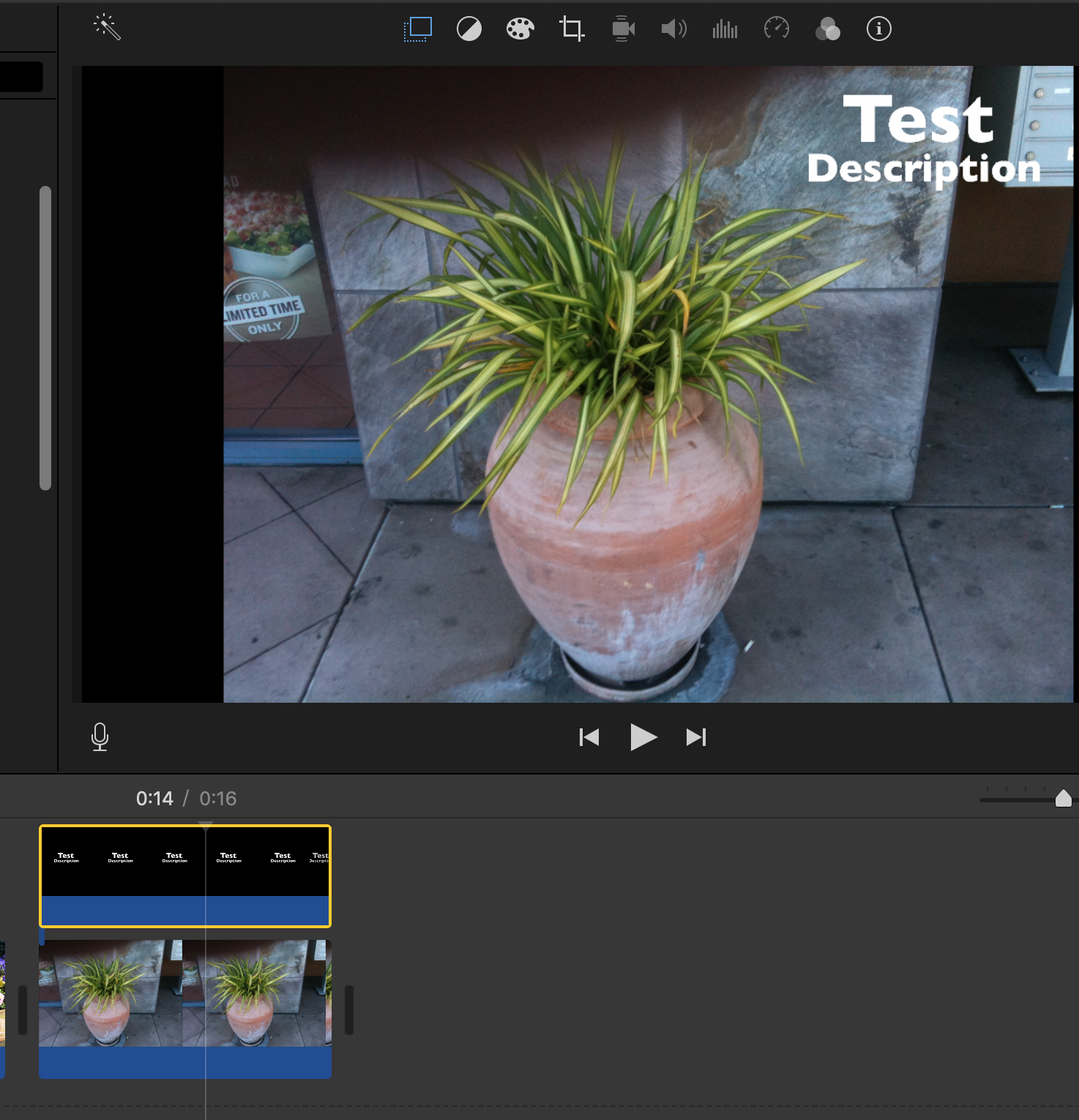 7. Adjust size and position of PiP text. Adjust the size and position of the overlaid title by dragging the adjustment rectangle that contains the text. Drag the corner to make it bigger or smaller. With your cursor move it to the position on the screen that you want. This link to the online Help menu explains how to use the Picture in Picture effect: https://help.apple.com/imovie/mac/10.1/#/mova1aaa682b