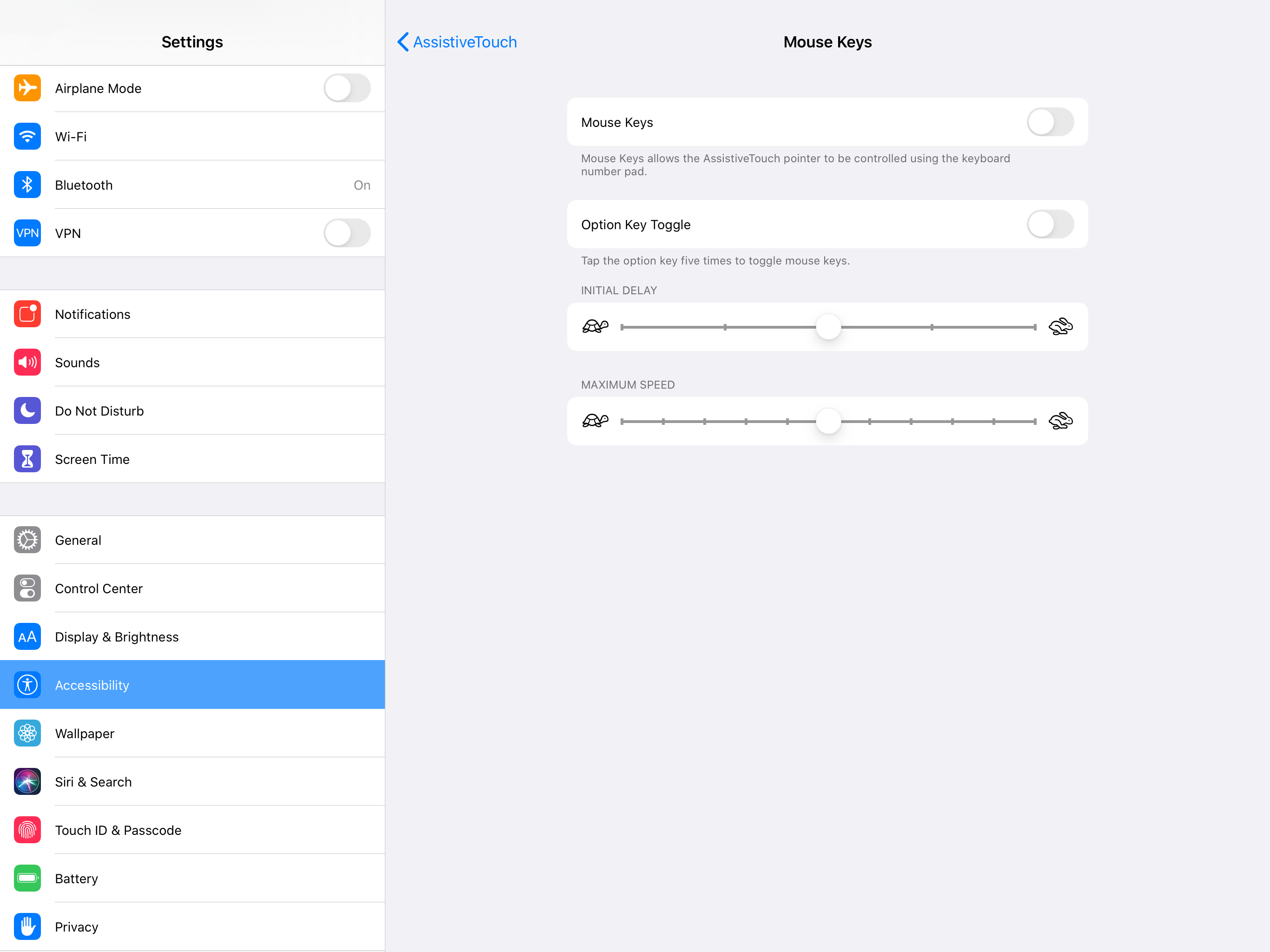 iPadOS 13 includes the ability to use an external pointing device, such as a mouse, with an iPad. Within iPad’s Accessibility settings includes a feature called Mouse Keys. Mouse Keys allows the AssistiveTouch pointer to be controlled using the keyboard number pad. Most often iPad will be paired with a Smart Keyboard which does not include a number pad. Mouse Keys will default the pointer control’s keys to the following:
