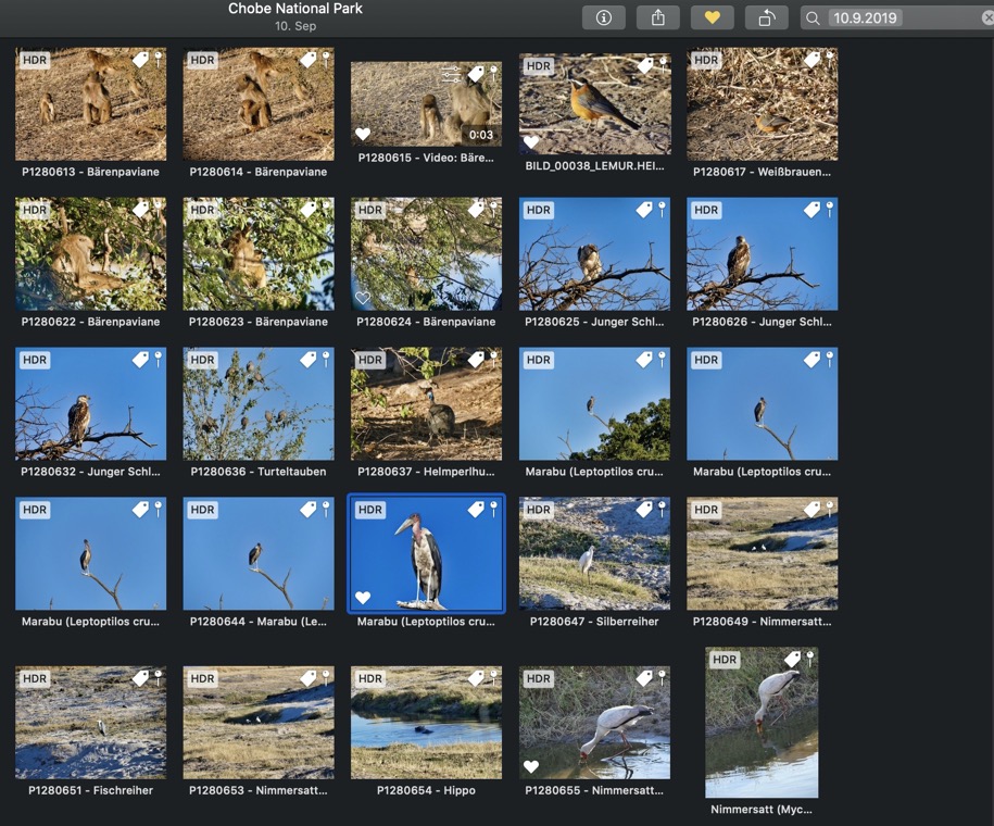 For example, with the keywords "2019_Okavango" and "Tag_10" checked: