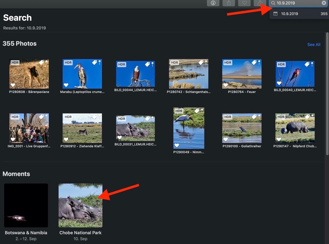 For example: The search result with the "Moments" at the bottom: (my Mac is set to use the date format day-month-year, enter the date according to the format you specified in the system preferences).