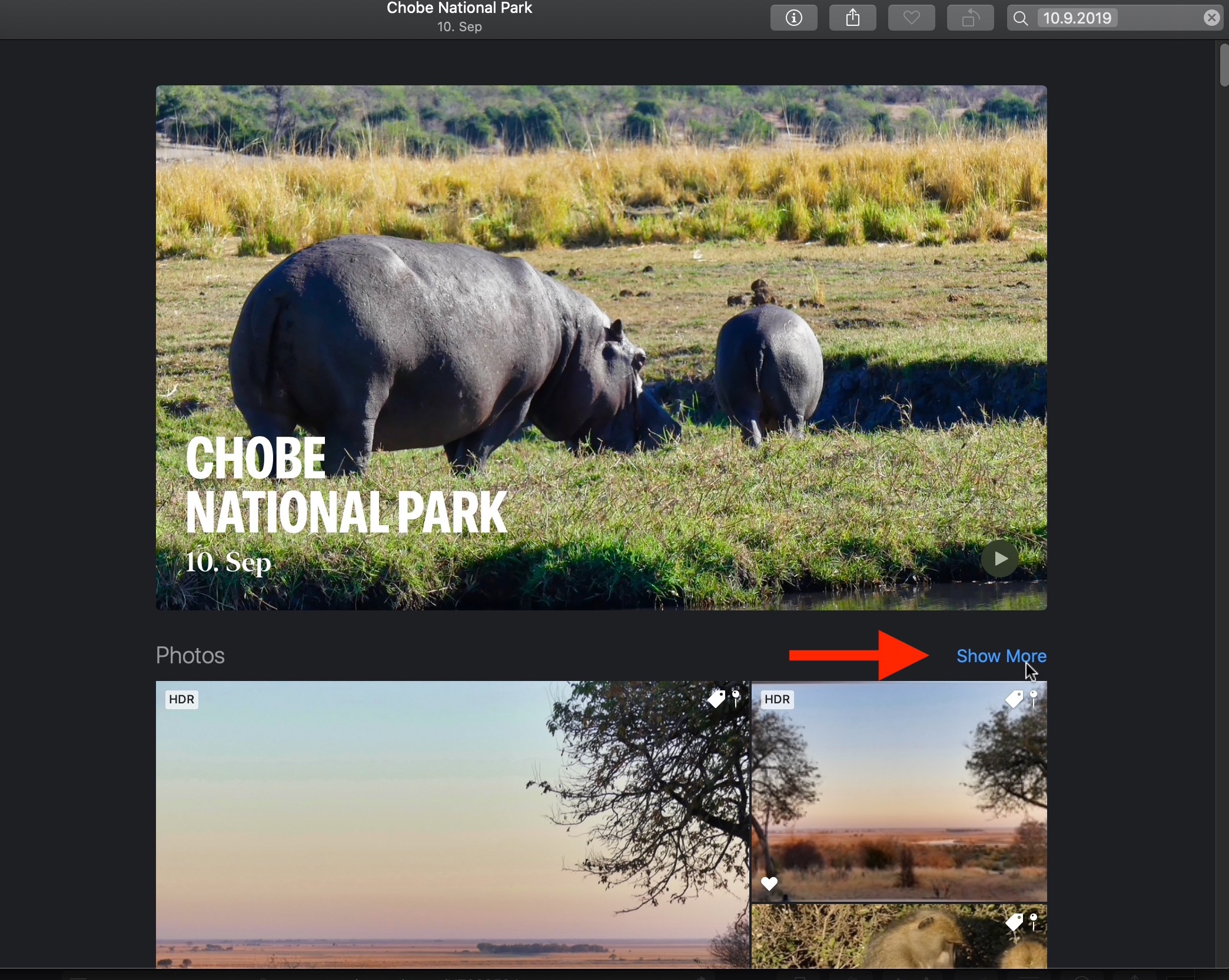 Since Photos 5.0 in Catalina the "Moments" tab and "Show in Moments" are missing from the user interface. We have the "Days" tab with a pretty tiled view of selected, cropped photo or video snippets, without titles or badge overlays. This view is nice for a quick slideshow of the best photos, but useless for managing the photo library and weeding out the bad shots. Clicking "Show All" will take us to "All Photos" instead of the moment, where the boundaries between the days are missing and it is hard to work in this view in a large library.