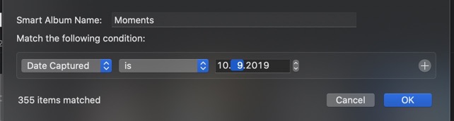 For a quick selection of the photos from a particular day, we could create a smart album "Moments". A smart album has many advantages. We can sort the photos and we can use the size slider to enlarge the thumbnails. We can use the Filter in addition to the smart rules.