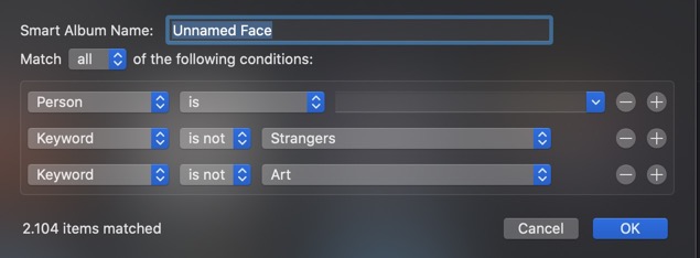 And I refine the smart album with the keyword rule, so it will not include photos with the keyword "Strangers" and "Art", combined with "Match All".