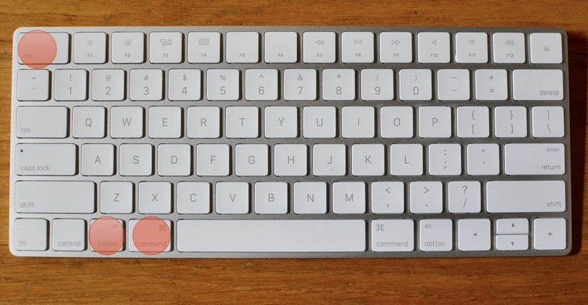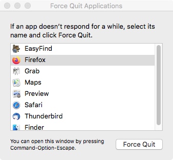 command-option-escape (Command often has the 4 leaf cloverleaf logo, or is a Windows logo key on keyboards designed to work with Microsoft Windows machines, and Alt key is the corresponding key on Windows keyboards for Option. The Control, CTRL keys are not to be used in this command).