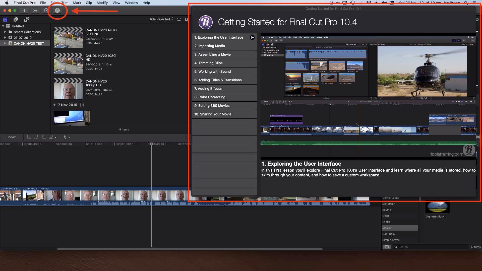 A single click on this button opens the tutorials there and then on top of the FCP X interface.