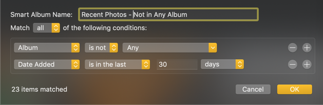 Photos 5: Problems with the Smart Album Rule: Album is not Any
