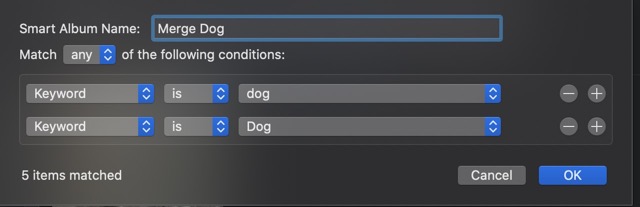 - Create a smart album (File > New Smart Album) with the two rules "Keyword is dog" and "Keyword is Dog" and combine them with "Match any ....". This album will contain all photos with any of the two keywords.