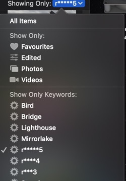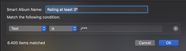 For Photos 5 I renamed the rating keywords again to be able to search for a minimum number of stars. Because a text search string needs to start with a letter, my new rating keywords are now starting with the letter "r" for rating, followed by the number of stars: r*1, r**2, r***3, r****4, r*****5. It looks ugly, but why complain, if it works. Now I can search again for all photos with a rating of at least 3 stars by searching for "r***". This search will find all items with rating keywords r***3, r****4, r*****5.