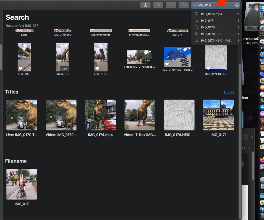 For example, when we are searching for IMG_0172.jpg, we could just enter "_0172" and Photos will find the file. But to find the files taken with a Panasonic camera wit the prefix "P" we have to include the prefix into the search search string, because it is not separated from the image number and search for "P1290293", not just "1290293".