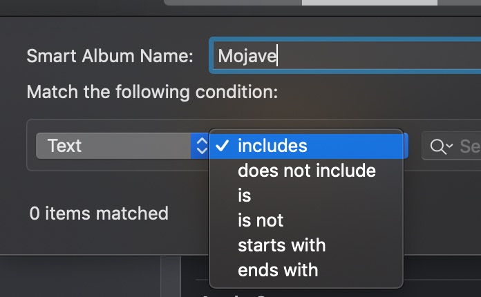 Now, in Photos 5 on Catalina, we only have "Text is", "Text is not", "Text starts with".