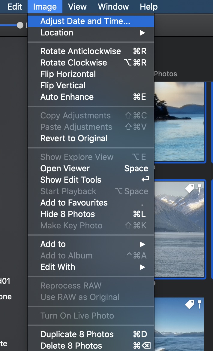 - We can correct the clock set in the camera or change the timezone with "Adjust Date and and Time". The date and time will be shifted for all selected photos by the same offset.
