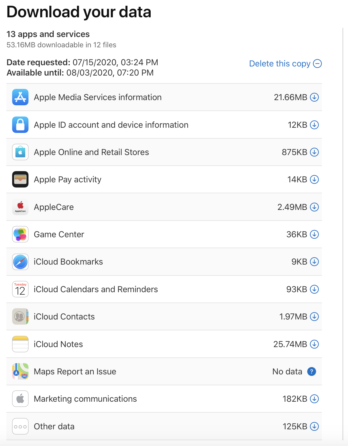 - Please be patient. In my experience, it took four days for the data to be ready, and altogether the files were around 53MB in size