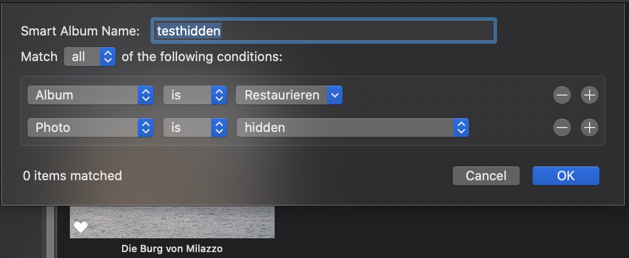 For example to see the currently hidden photos in my album "Restaurieren", I am using this smart album: