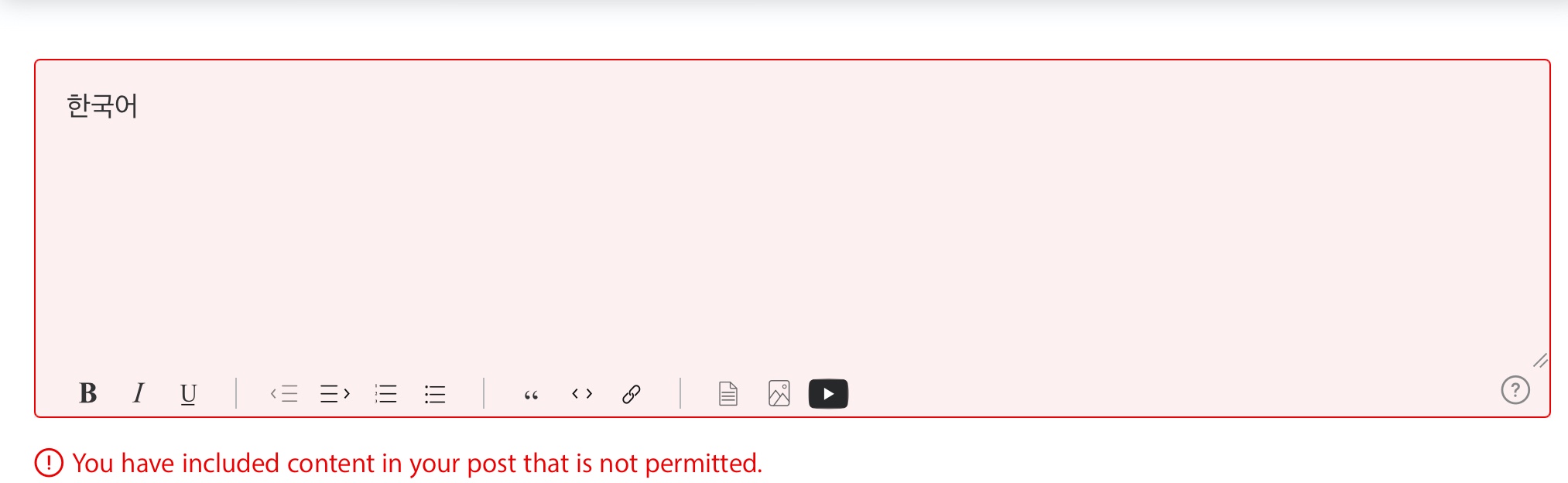 If you try to include characters in certain foreign languages in your post, you may find it impossible to submit it, getting the red box and error message shown below, with Korean as the example: