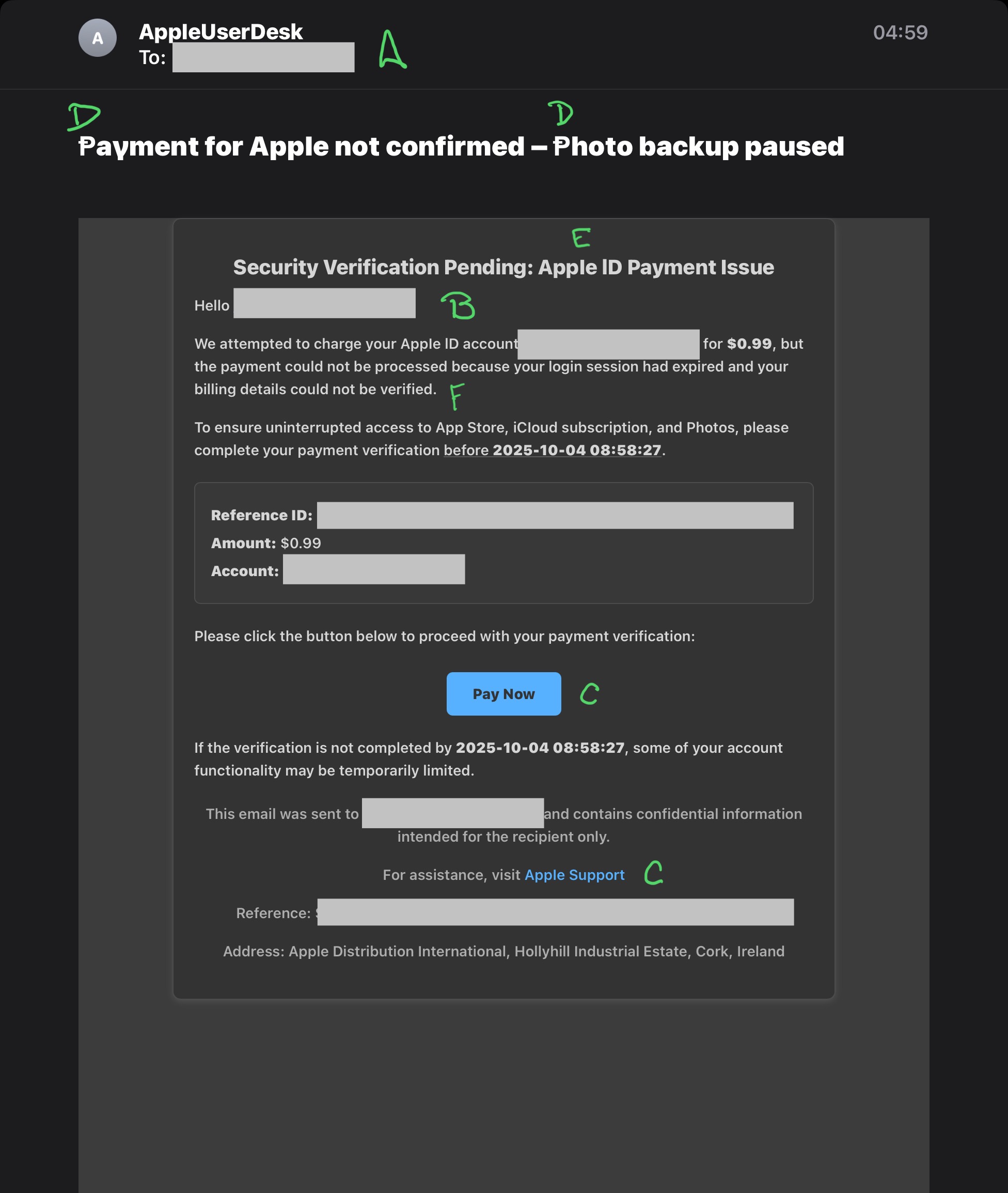 There are other oddities here too, such as that “AppleUserDesk”, and the waffle-worded deadline threatening “may be temporarily limited”, the round A with the sending address and not the expected Apple logo (obscurely called “BIMI”), and (not visible here) incongruities with some details that are within what was here masked.
