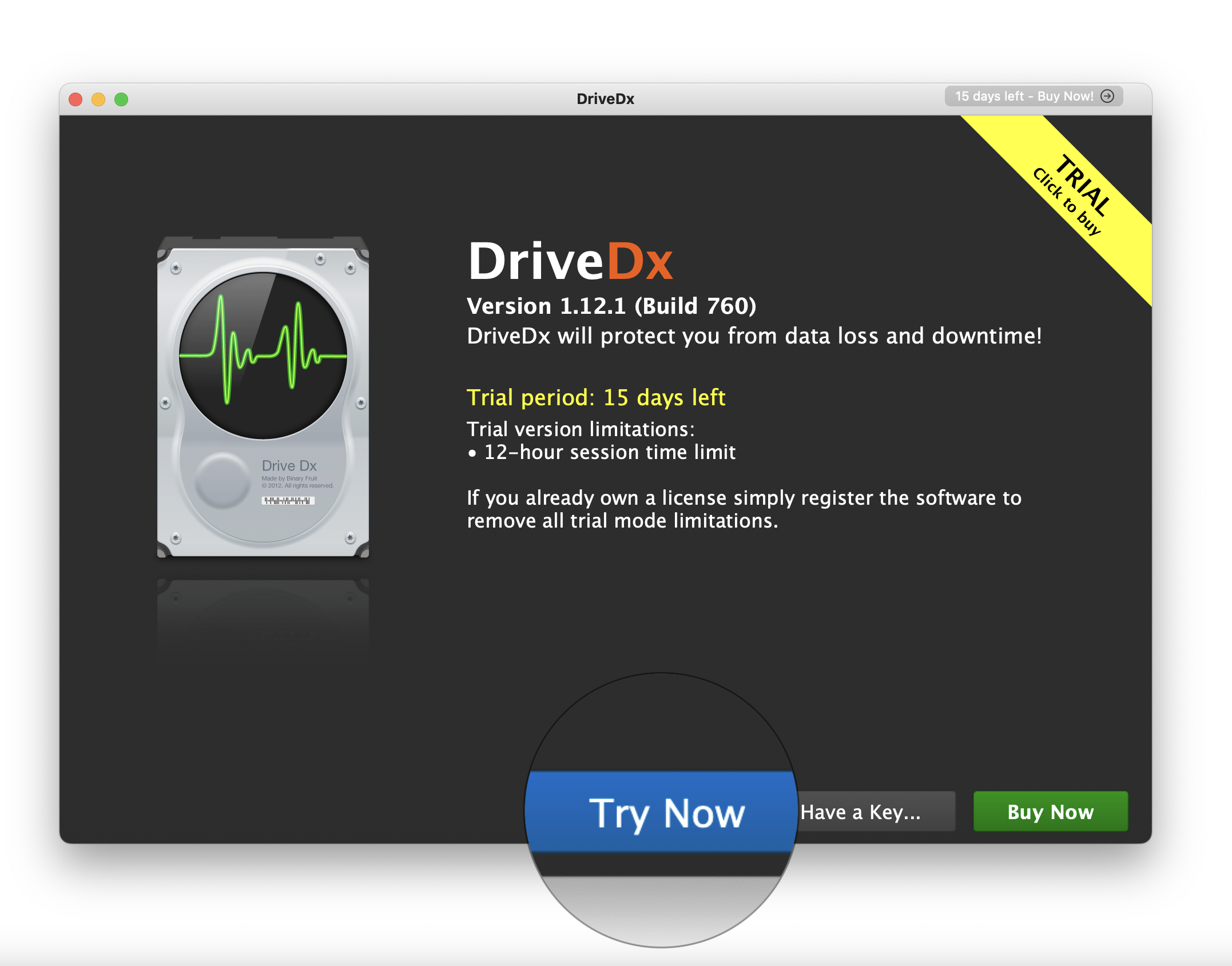 In DriveDx, select "Try Now" to start your trial and access your disk's health.
