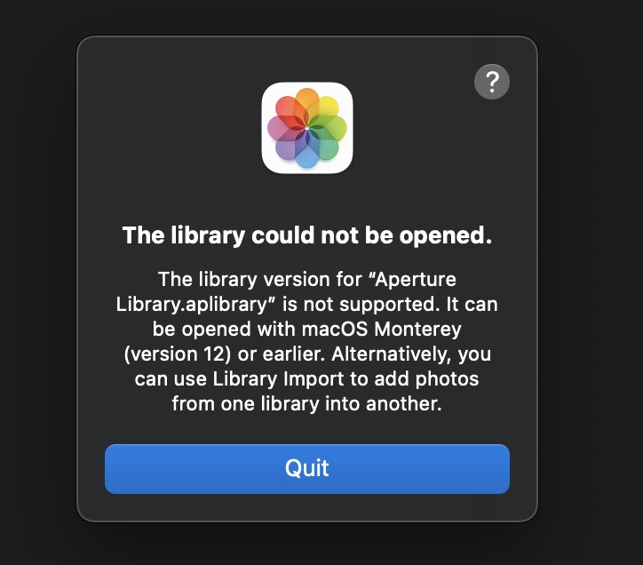 If you still have old Aperture Libraries that need to be migrated to another application, you'd better get it done before you install macOS 13 Ventura.