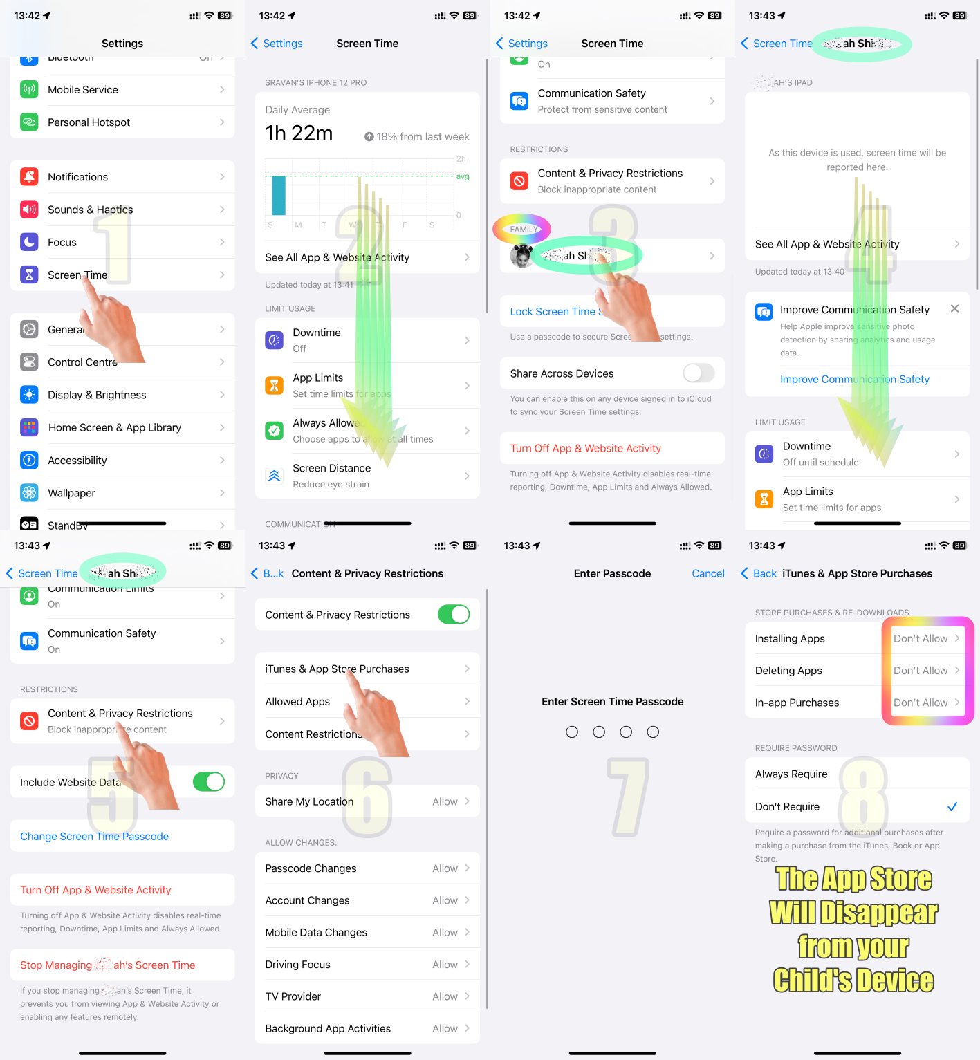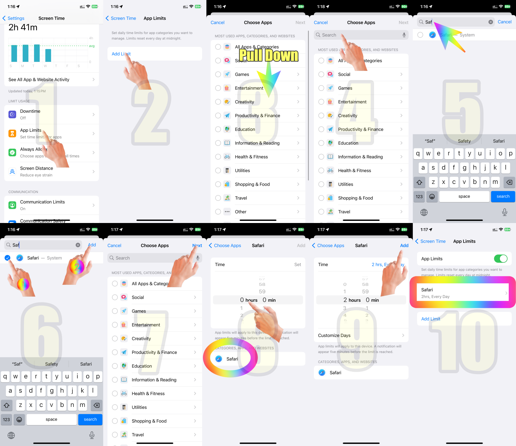 The GIF below will depict how to set Screen Time Restrictions for your Child's Device