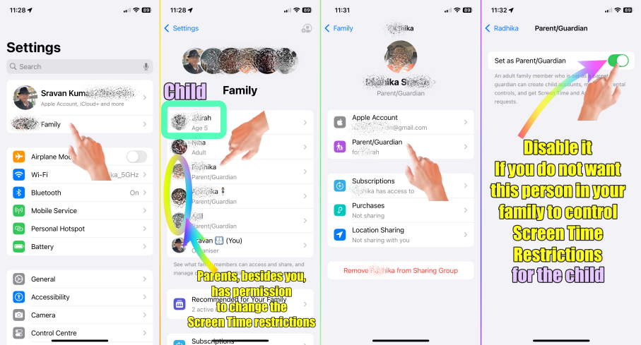 If you notice that your child’s Screen Time restrictions are being altered without your knowledge, it’s important to review the list of people who have been assigned as parents or guardians in the Screen Time settings. Anyone added as a parent has the authority to change or override restrictions. Go to Settings > Screen Time > Family and carefully check who is listed as having parental control. If you find any entry that looks unusual or that you did not authorize, remove their permission immediately to ensure that only trusted individuals can manage your child’s Screen Time restrictions.