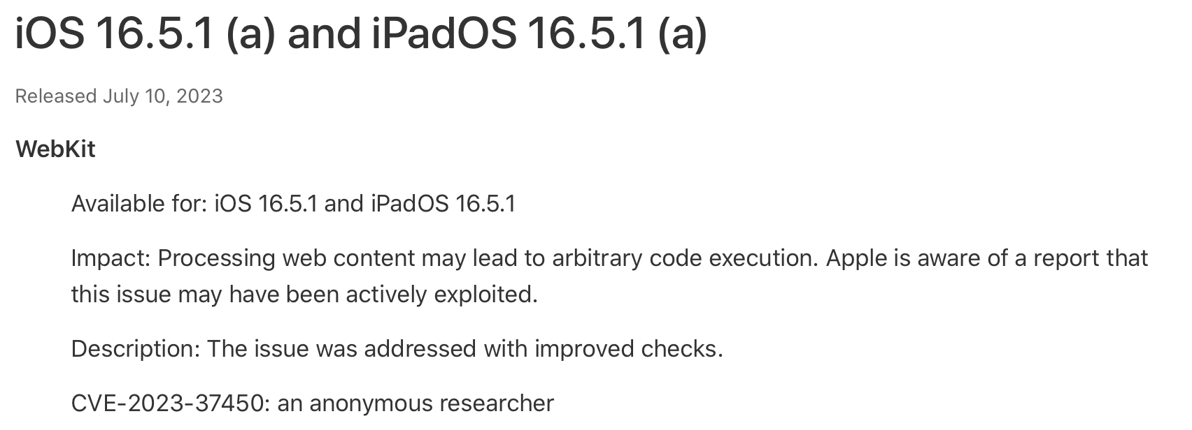 The Rapid Security Response update for iOS and iPadOS 16.5.1 was to address a vulnerability in Safari - "Processing web content may lead to arbitrary code execution. Apple is aware of a report that this issue may have been actively exploited."