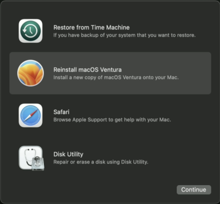 When the recovery utilities appear again, select Install/Reinstall macOS and choose Continue. Then, follow the onscreen instructions to install macOS.
