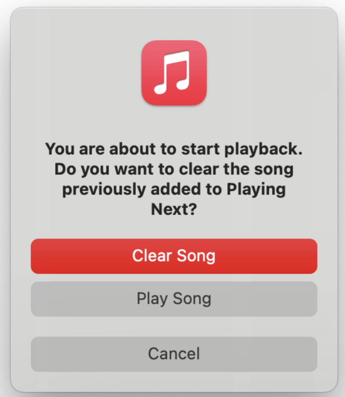 “You are about to start playback. Do you want to clear the song previously added to Playing Next?”