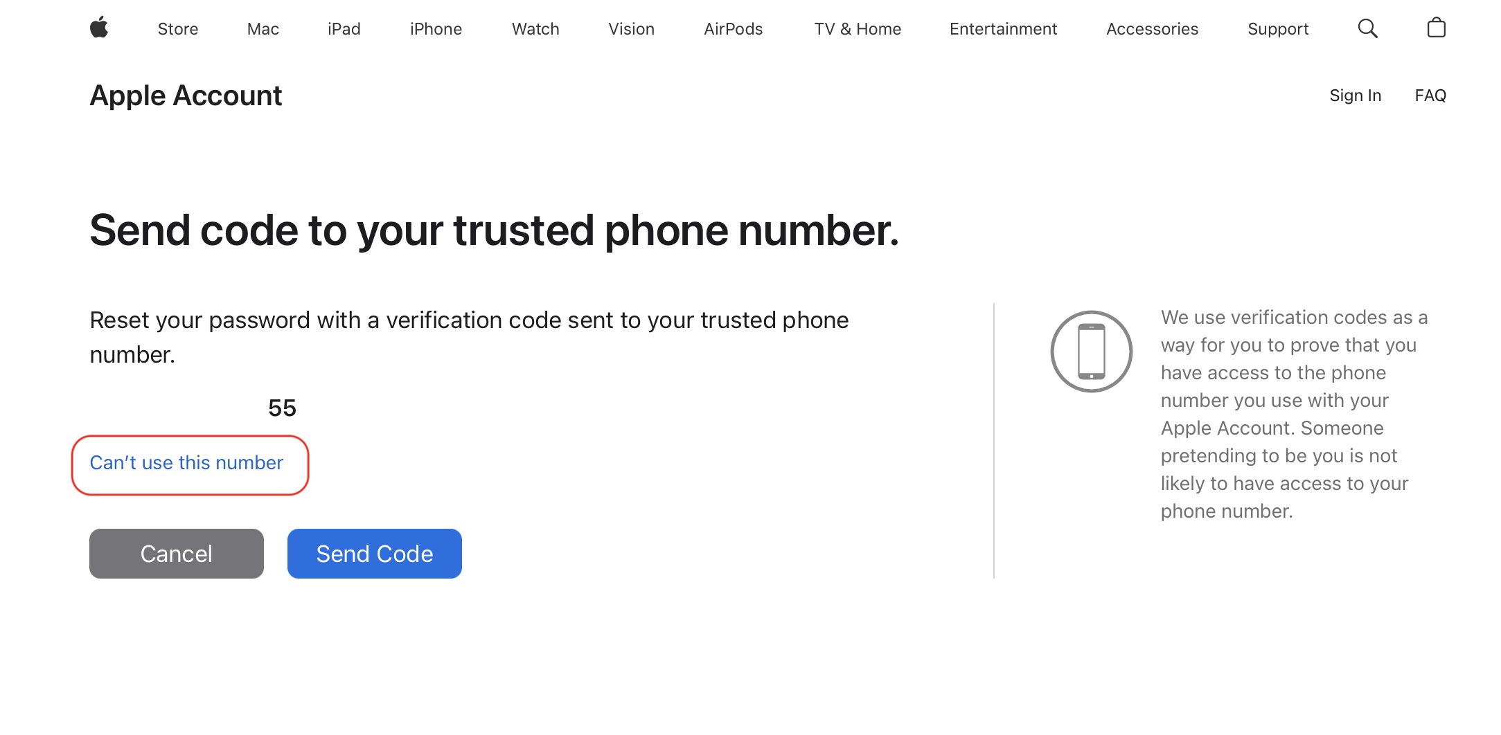 If you still have access to the trusted phone number, but the issue lies with the device or if you have a replacement physical SIM card with your same number but do not have access to a trusted device; put your SIM card in another device. You can then have a verification code sent to your phone number to reset your password in Settings or from the Support app. This may seem like a hassle, but usually account recovery can be avoided with doing so.