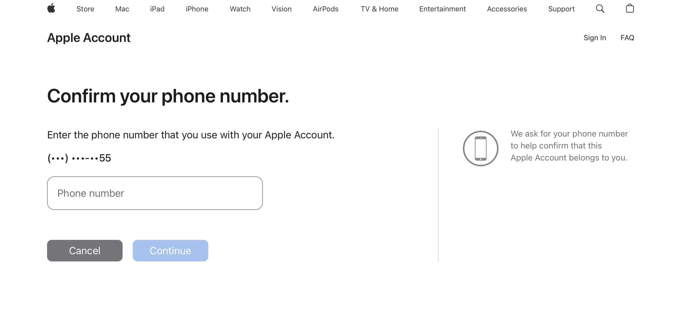 - You will then be prompted to confirm the trusted phone number on file, and will only see the last two digits of the phone number, as a hint. Confirm the phone number.