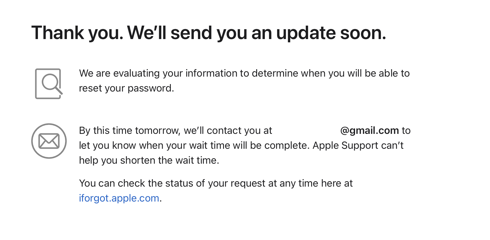 “Thank you. We’ll send you an update soon. We are evaluating your information to determine when you will be able to reset your password.”