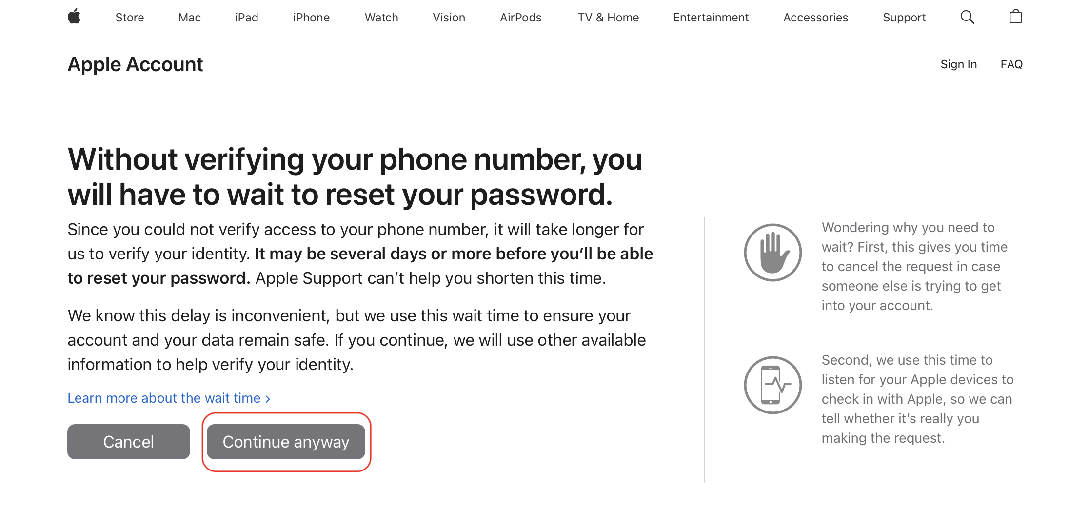 - On the next page, at the very bottom, select ‘Continue Anyways’. This page briefly warns you about the estimated recovery timeframe to regain access being longer.