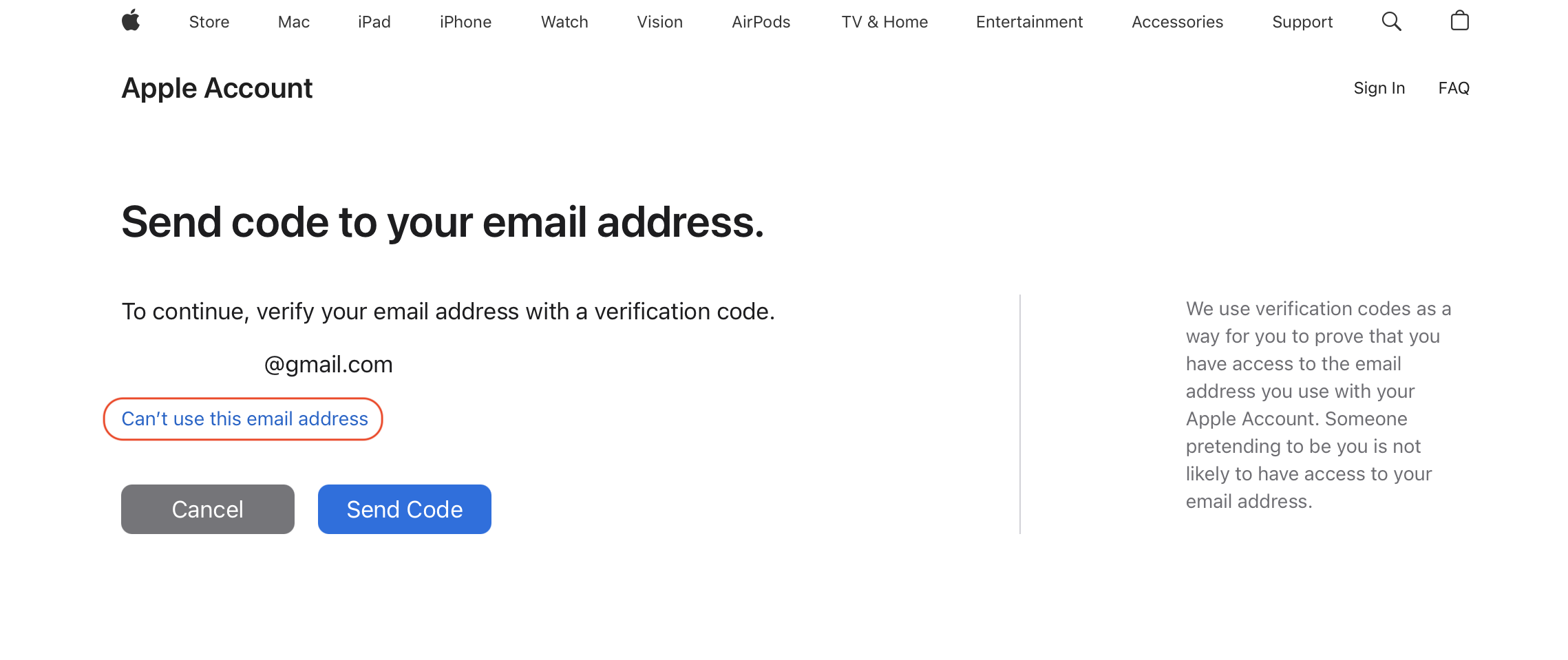 - Now you will be prompted to enter the verification code sent to your Apple Account email address. Enter the code, or select “Can’t use this email address?” If your Apple Account email address ends in @icloud.com, @me.com, or @mac.com you will not be able to receive this verification code.