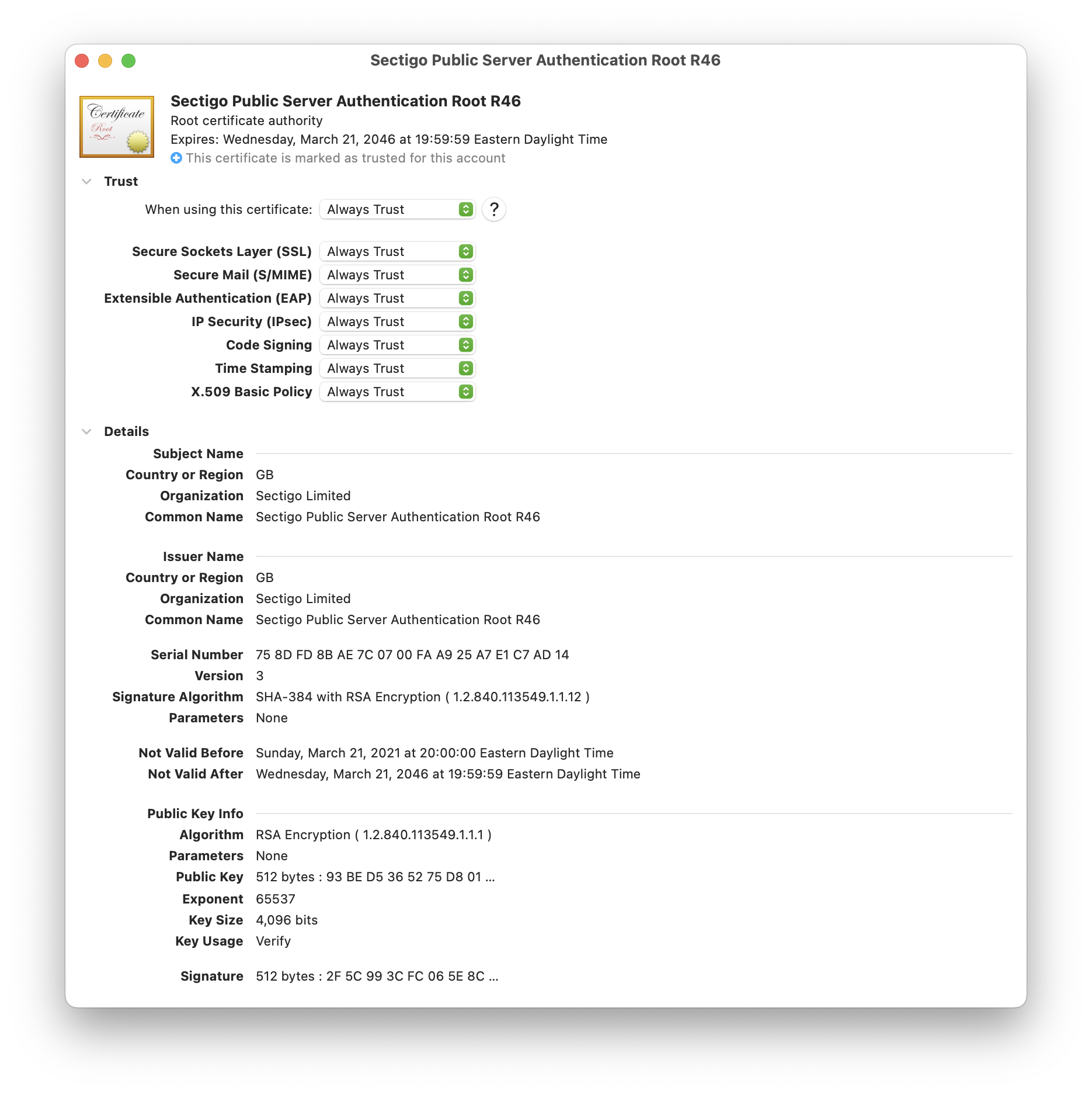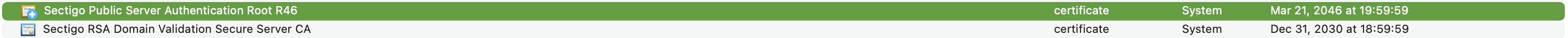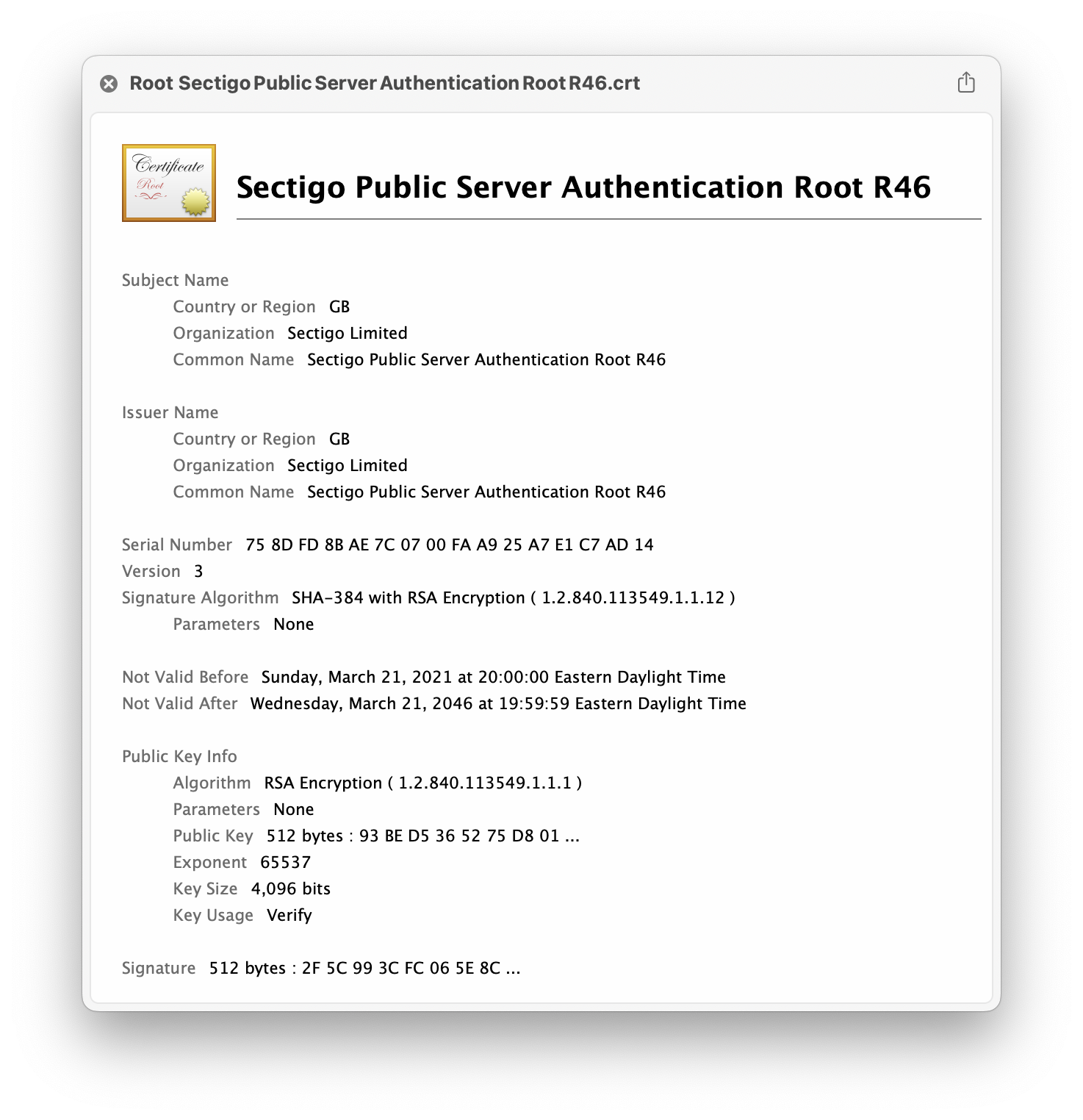 You'll get a file Root Sectigo Public Server Authentication Root R46.crt, and a quick look (from within the Keychain Access import picker) will show the entry as: