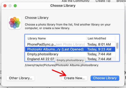 To open any of your Libraries in Photos, you can use the Library Chooser, or you can just double click one.