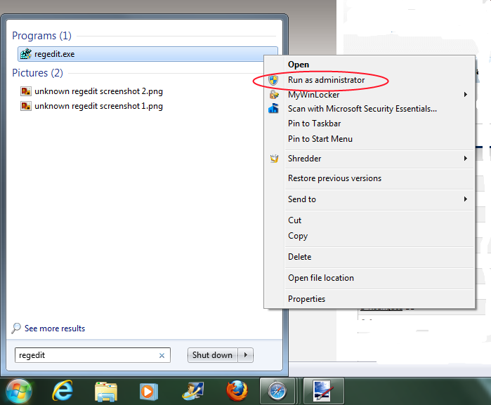 (2) Launch Regedit as an administrator. In your Start Search field, type regedit. Right-click on the Regedit entry that comes up and select "Run as administrator" as per the following screenshot: