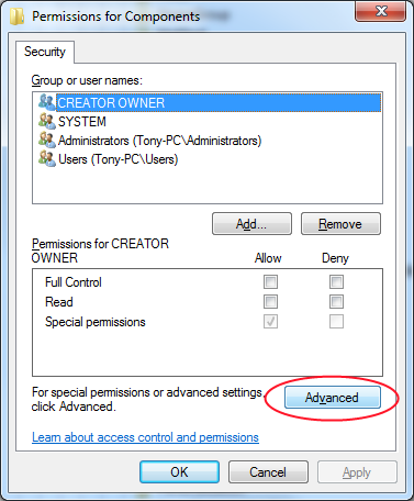 (12) In the "Permissions for Components" screen that comes up, click the Advanced button: